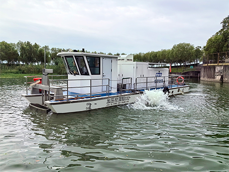 公司研發(fā)的加壓控藻船,以玻璃鋼船體為平臺,配置藍藻打撈、壓力控藻和曝氣裝置...